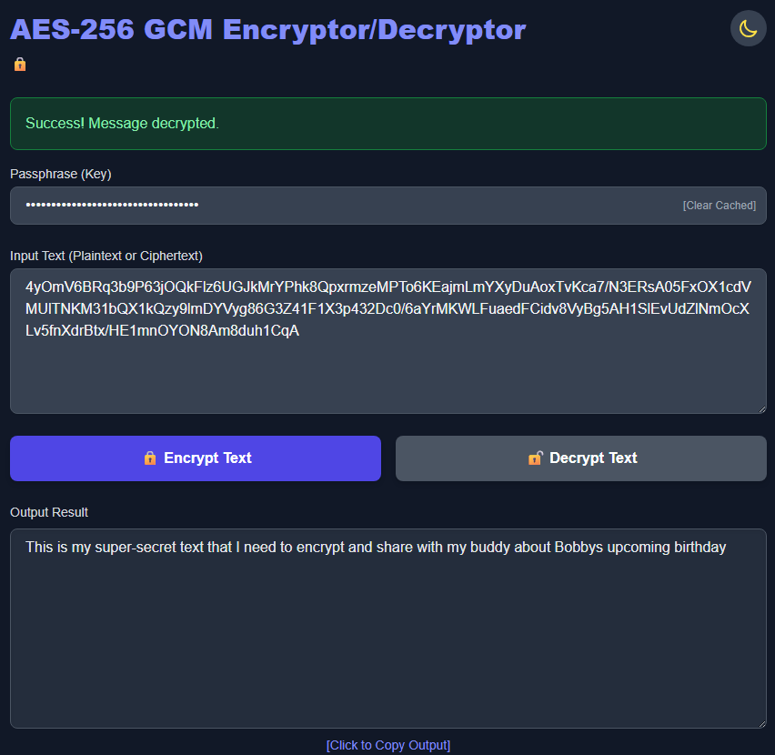 Output Result: “This is my super-secret text that I need to encrypt and share with my buddy about Bobbys upcoming birthday”