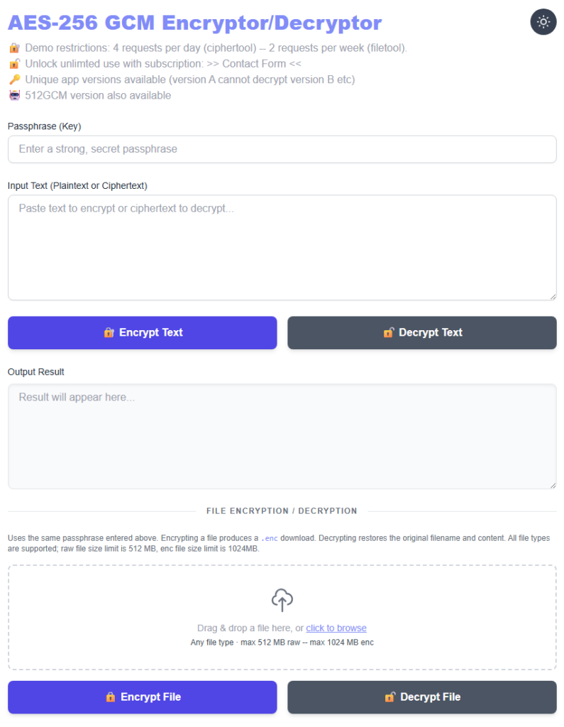 - Enhanced AES-256 CGM: Uses a unique additional hardcoded hidden Key in conjunction with the variable Passphrase to result different ciphertext. The same exact version must be used to decrypt the ciphertext.