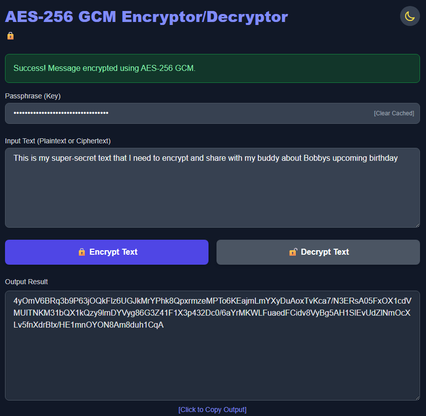 Input Text: “This is my super-secret text that I need to encrypt and share with my buddy about Bobbys upcoming birthday.”